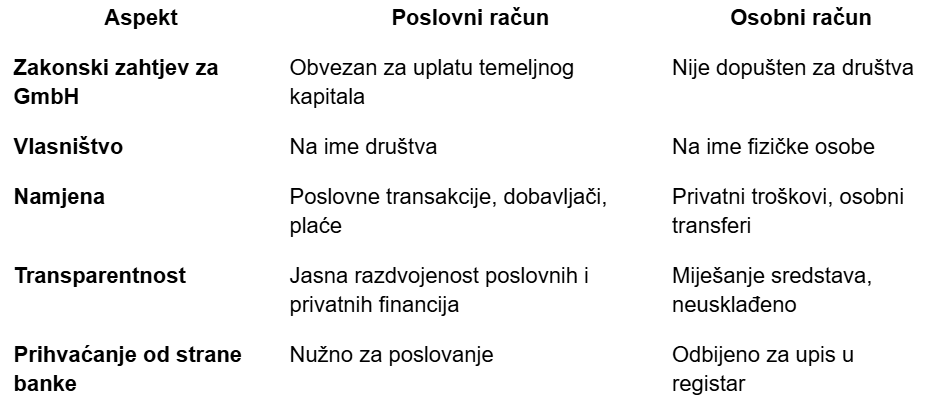 Poslovni račun je neizostavan dio osnivanja GmbH u Švicarskoj. Osobni račun može biti dovoljan za privatnu uporabu, ali ne ispunjava zakonske ni financijske zahtjeve društva.